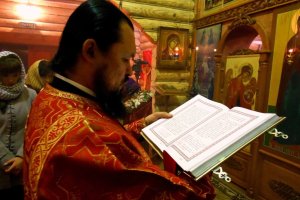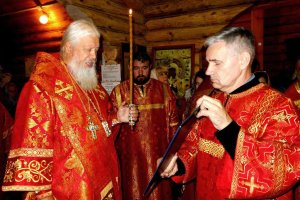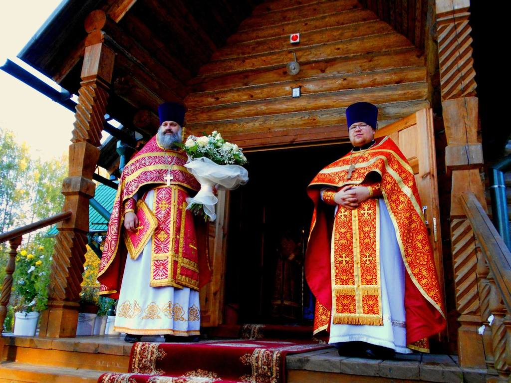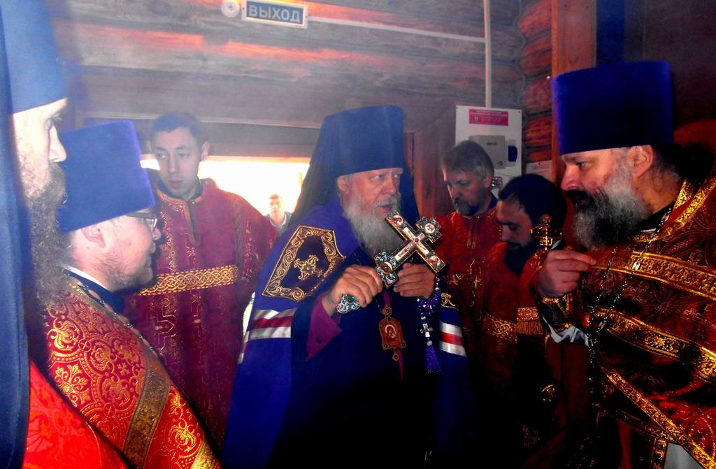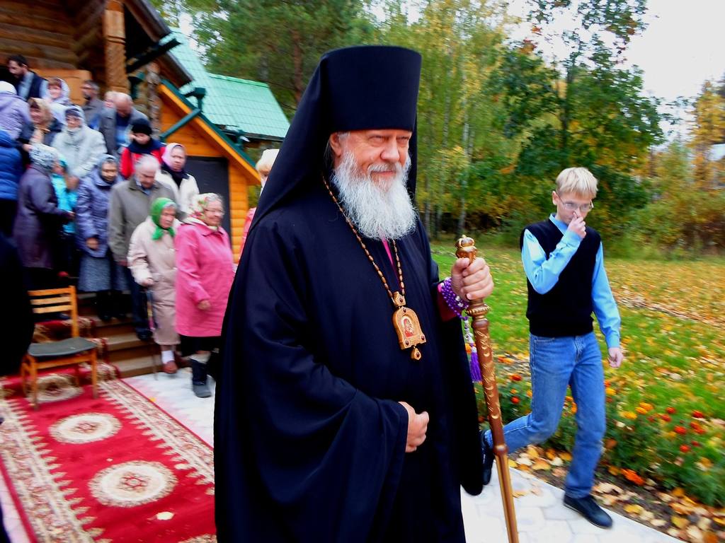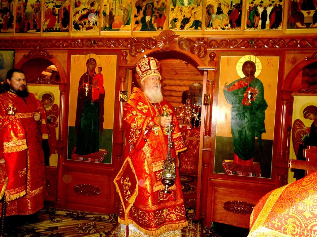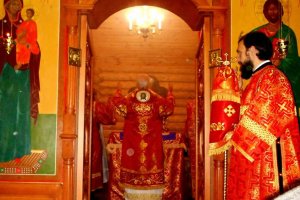 Спустя минут двадцать прибыл Владыка Августин, которого тепло встретил настоятель нашего храма отец Иоанн. Благословляя всех, епископ в сопровождении священства направился в храм, где его ожидали священство и пономари. Владыка всегда старается на сей праздник совершить богослужение в этом знаковом месте.