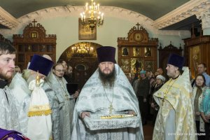 По завершении Литургии владыка Августин вручил памятные подарки протоиерею Иоанну Долбунову. Настоятель храма преподнес в дар Его Преосвященству предмет церковной утвари.